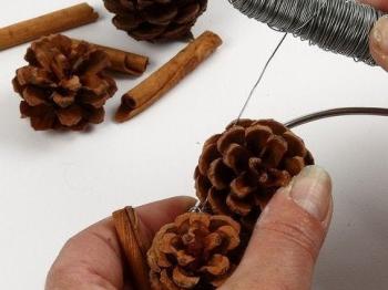 Storže pritrdite na osnovo s pomočjo cvetličarske žice. Cimetova palčke in janeževe zvezde pritrdite med storže s pomočjo pištole na vroče lepljenje.