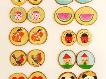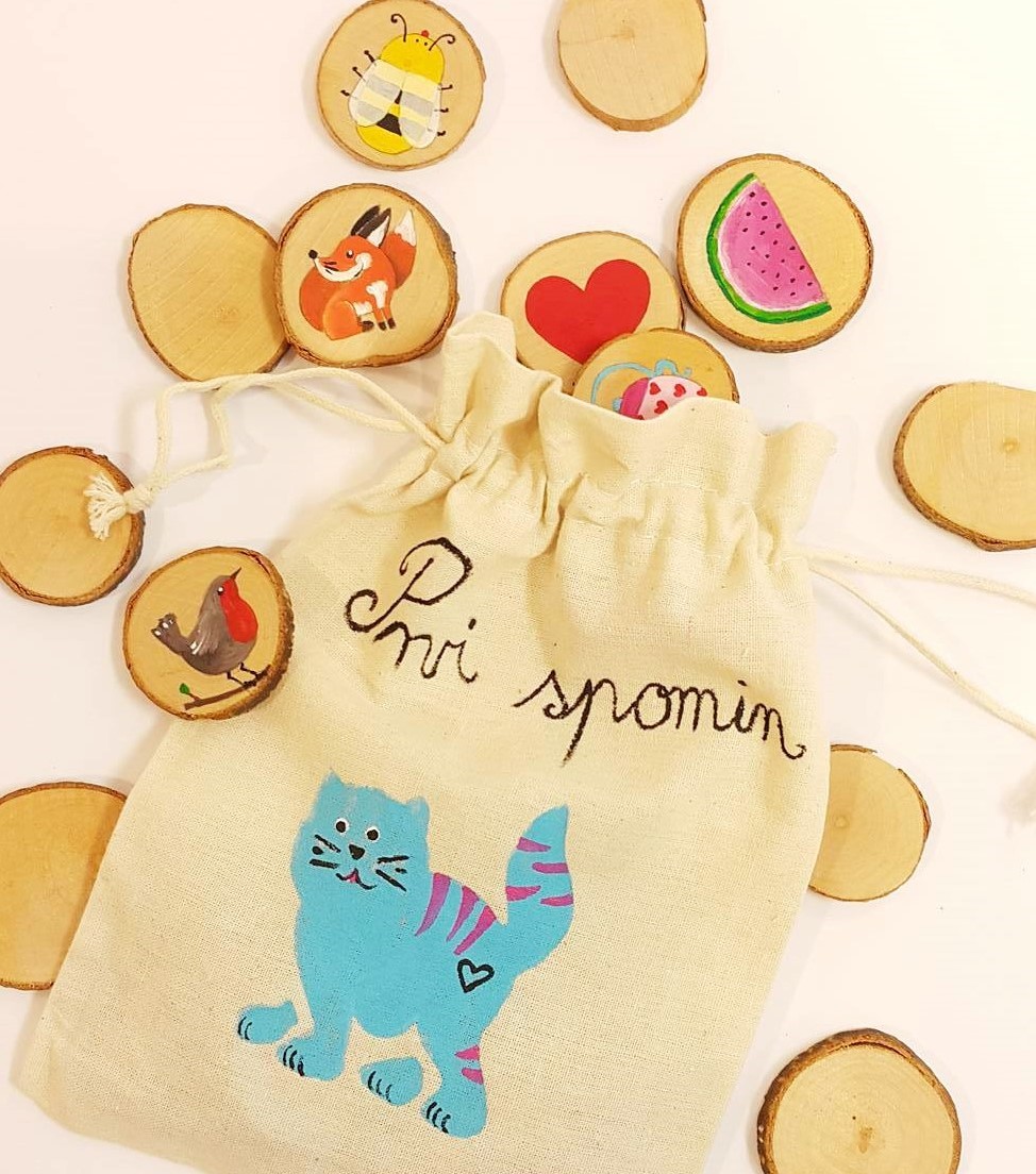 Navodila za igro “Spomin”: Lesene diske položite na igralno površino s sličico navzdol, tako da z njimi oblikujete pravokotnik. Igralec, ki je na vrsti, izbere disk in med preostalimi poskuša poiskati ustrezen par (disk z enako ilustracijo). Če najde ustrezen par, vzame oba diska k sebi in ponovno poskusi poiskati par. Če pri iskanju para ni bil uspešen, položi oba lesena diska nazaj na igralno površino, z igro pa nadaljuje naslednji igralec. Igre je konec, ko igralci poberejo vse diske. Zmaga igralec, ki zbere največje število diskov. Veliko prijetnih trenutkov ob igranju!