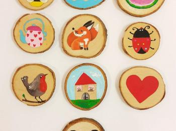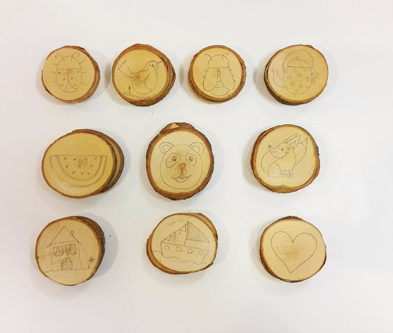 Zaščitite delovno površino, pripravite si lonček z vodo in paleto za mešanje barv. Pripravite 20 lesenih diskov. Izberite 10 motivov in vsakega skicirajte s svinčnikom na 2 diska (par).