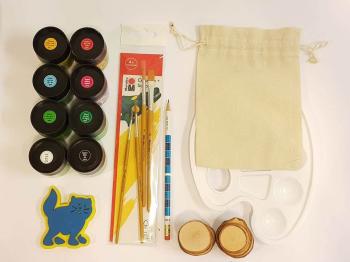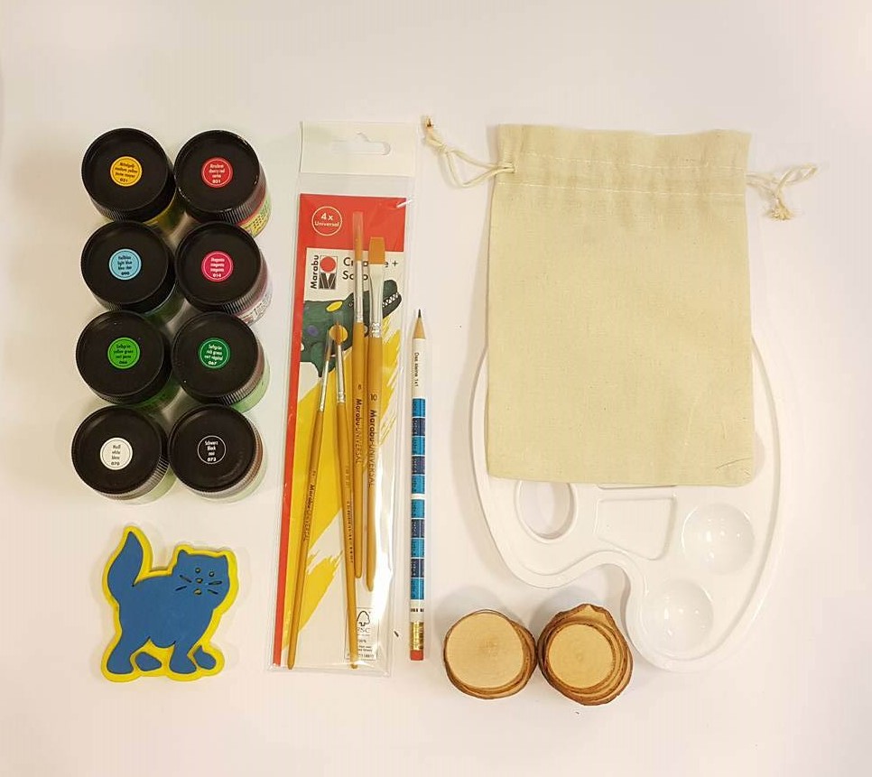 H24 065 02 Leseni diski, Φ3-5cm, 200g, 0184 00 201 Komplet čopičev “Creativ + School”, 1401 05 070 Decormatt, 50ml, bela, 1401 05 073 Decormatt, 50ml, črna, 1401 05 021 Decormatt Acryl, 50ml, srednje rumena, 1401 05 031 Decormatt, 50ml, škrlatno rdeča, 1401 05 014 Decormatt Acryl, 50ml, škrlatna, 1401 05 090 Decormatt Acryl, 50ml, svetlo modra, 1401 05 066 Decormatt, 50ml, rumeno zelena, 1401 05 067 Decormatt Acryl, 50ml, zelena, 1822 KP72 Svinčnik z radirko “Poštevanka”, 1626 00 001 Plastična paleta za meš. barv, 23x17cm, 10 delna, 8767 01 Komplet štampiljk MALI “Kmetija”, H12 149 00 Vreča iz bombaža z vrvico, 10x15cm, 14x20cm, 1130 05 100 Decorlack, 50ml, prozorna, 57 99 00 Lonček za vodo