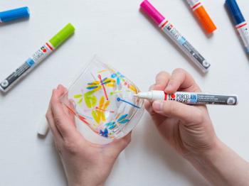 Aktivirajte flomaster Marabu Porcelain & Glas Painter tako, da ga vsaj 60 sekund temeljito tresete in nato njegovo konico najmanj 15x počasi in nežno pritisnete ob podlago. Flomaster je aktiviran, ko priteče barva na konico. Pred risanjem po steklu preizkusite flomaster na papirju.