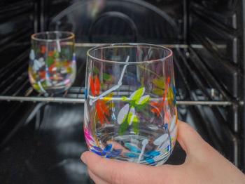 Pred utrjevanjem v pečici naj se kozarci vsaj 4 ure sušijo na sobni temperaturi. Utrjevanje v pečici poteka na naslednji način: poslikan kozarec položite  v ohlajeno pečico. Prižgite pečico in nastavite temperaturo na 160° C. Poslikavo 30 minut utrjujte v pečici, vendar se čas utrjevanja šteje šele od trenutka, ko lučka za temperaturo na pečici ugasne. Po končanem utrjevanju odprite vrata pečice in počakajte, da se kozarci ohladijo. Tak način utrjevanja barv poskrbi, da so kozarci pralni tudi v pomivalnem stroju do temperature 50° C.