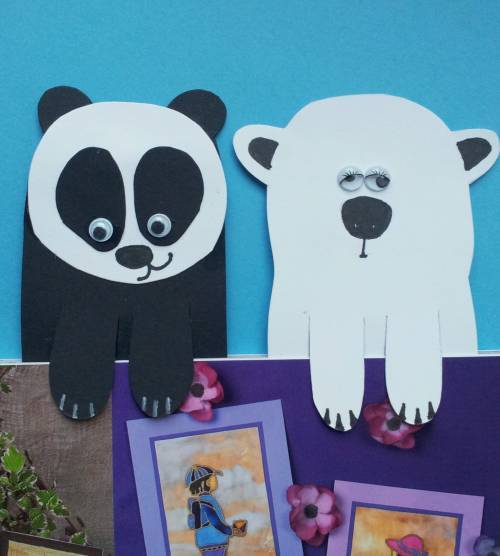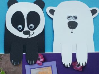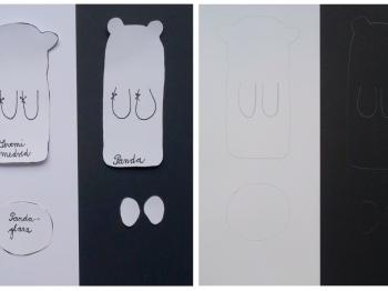 S pomočjo lepila Uhu Bastelkleber prilepite  severnemu medvedu par gibljivih oči. Pandi prilepite glavo, na glavo prilepite lise in na lise nalepite par gibljivih oči. S svinčnikom zarišite smrček, kremplje, usta in ušesa. Narisano prerišite s črnim flomastrom Brilliant painter. Pandi narišite kremplje z belim flomastrom Brilliant Painter.