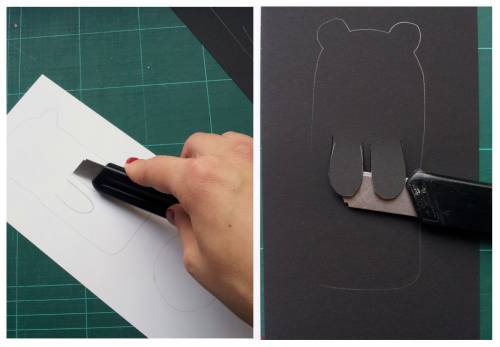Medvedu in pandi narišite tačke in jih izrežite s skalpelom ali ostrim nožem. Pri rezanju s skalpelom uporabite rezalno podlogo in pazite, da vedno režete stran od sebe. Izrežite še vse preostale dele.  Z radirko izbrišite linije, ki so vam ostale od svinčnika.