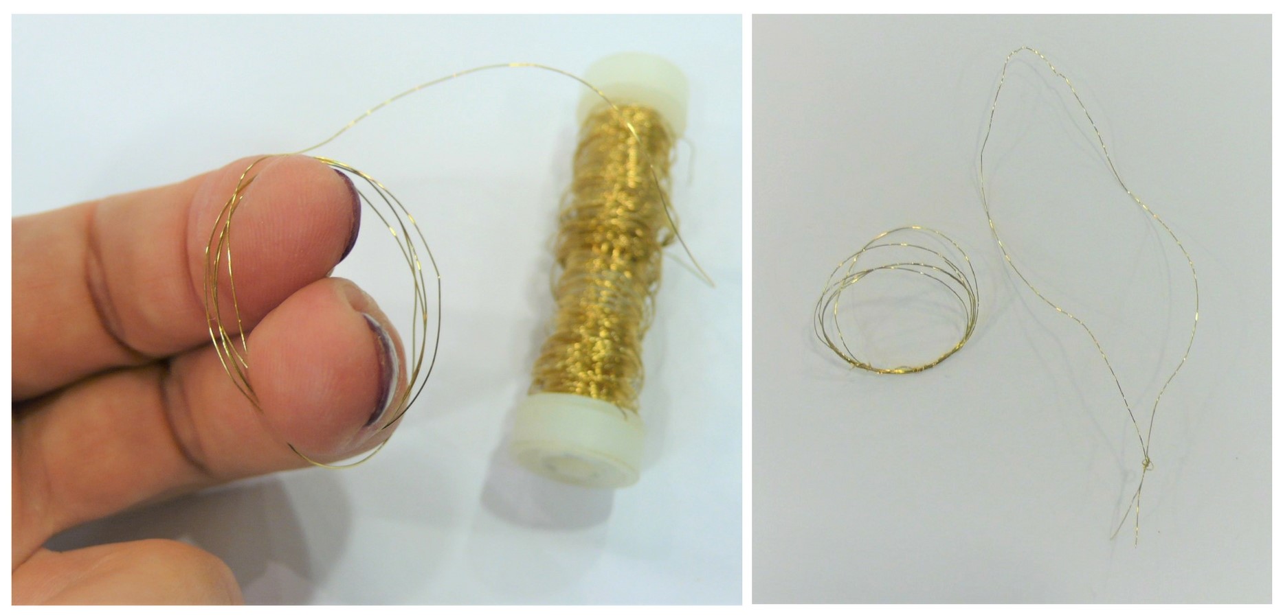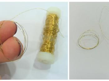 Zlato žičko večkrat ovijte okrog prstov, da oblikujete več krogov. Konec žičke ovijte okrog krogov, da jih učvrstite. Odrežite približno 13cm zlate žičke in naredite zanko za obešanje.