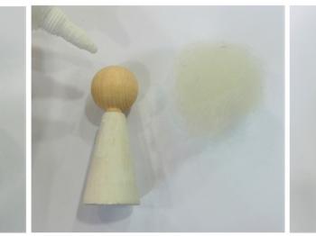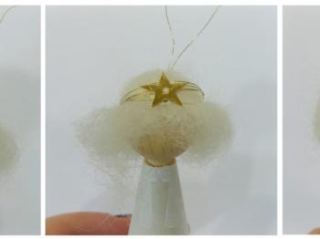 Sij iz zlate žičke poveznite angelu na glavo. Spredaj prilepite na sij zlato zvezdico, zadaj pa kapnite kapljico lepila, da se sij prilepi na volno. Ko se bo lepilo posušilo bo postalo prozorno.