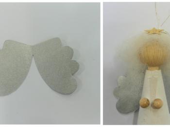 Iz srebrnega 130g barvnega papirja izrežite krila. Prilepite jih angelu na hrbet. Kot dlani prilepite dve leseni perlici.