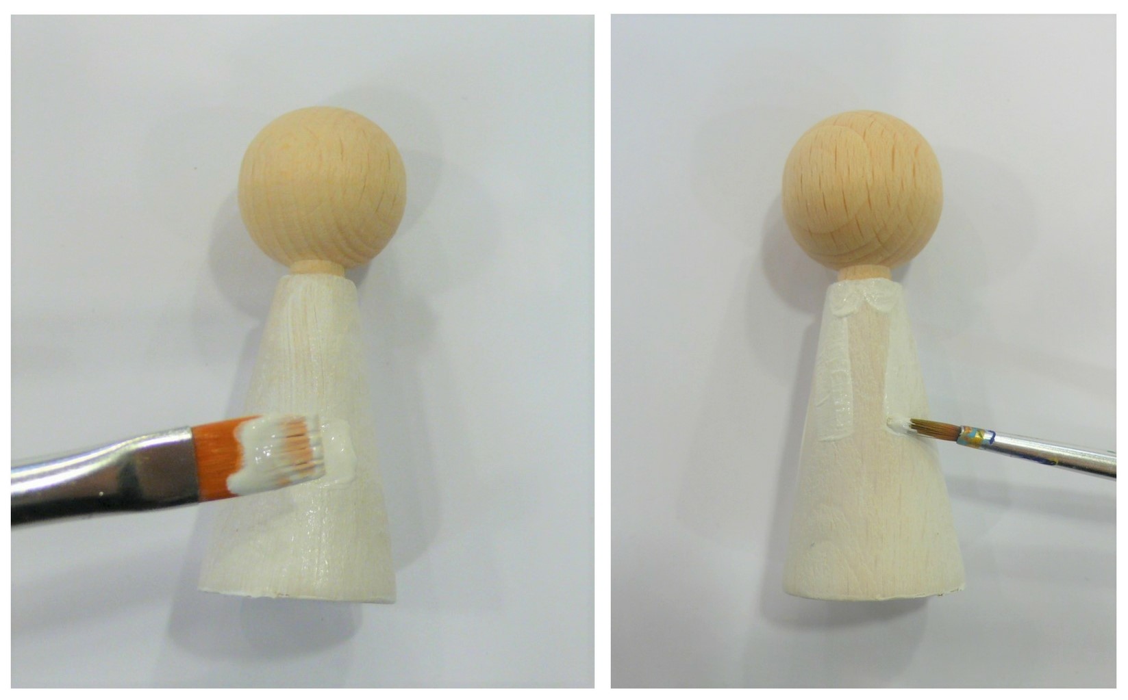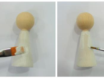 Pripravite leseno figurico in jo pobarvajte z belo Marabu Chalky-Chic barvo. Ko se barva posuši narišite rokave in bel ovratnik.
