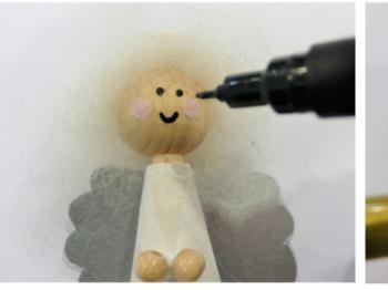 Z akrilno barvo narišite angelu lica. S črnim flomastrom Marabu Brilliant Painter narišite angelu oči in usta. Z zlatim flomastrom obrobite ovratnik.