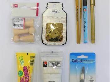 H14 217 06 Lesene figurice 23x60mm, 3 kosi, 02610 050 171 Marabu Chalky-Chic, 100ml, barva planike (bela), 0183 00 008 Čopič Marabu-Universal, ploščat, 8, 0184 00 001 Čopič Marabu-Universal, okrogel, 1, 0121 08 073 Brilliant Painter, 0.8mm, črn, 0121 08 084 Brilliant Painter, 0.8mm, zlat, U477351 Lepilo UHU Bastelkleber, 60g, WE975 5009 Škarje WEDO, Cut-it, 13cm, rožnate/bele, 1401 39 231 Decormatt Acryl, 15ml, b. divje vrtnice, H22 322 95 Žica za nakit, Φ0.25mm, 10m, zlata, H14 004 05 Lesene kroglice, Φ6mm, nar. rjave (125), H10 080 02 Prava ovčja volna za polstenje, 50g, naravna, 19743-000-311 Konfeti “Zvezdice”, Φ15mm, 12g, zlati, B2192289 Barvni papir, 130g, B2, srebrn
