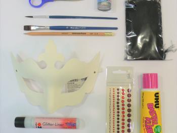 H15 078 61 Majhna maska, 18.5×7.5cm, bela, 11300 039 782 Decorlack Acryl, 15ml, kovinsko srebrna, 1227-2 Natur Design svinčnik z radirko, 01860 000 010 Čopič Marabu-Forte, ploščat, 10, 01870 000 006 Čopič Marabu-Forte, okrogel, 6, 18030 009 582 Glitter Liner, 25ml, srebrn, H91 130 89 Bleščice Brillant, fine, 12g, črne, H99 401 56 Sito za fine bleščice Brillant, Φ39mm (1), KS-C-STRASS-3RED Kristalčki za likanje Ki-sign, 3mm, rdeči (140), KS-C-STRASS-5RED Kristalčki za likanje Ki-sign, 5mm, rdeči (60), WE975 411 Škarje WEDO, majhne, koničaste, 11.4cm, zelene, H10 290 01 Perle različnih oblik, 40 kosov, U477351 Lepilo UHU Bastelkleber, 60g, H10 043 81 Dekorativna peresa, 2g, črna