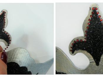 Različne velikosti kristalov na samolepilni borduri lahko poljubno kombinirate. Mi smo uporabili vse velikosti, ki smo jih simetrično razporedili po maski.
