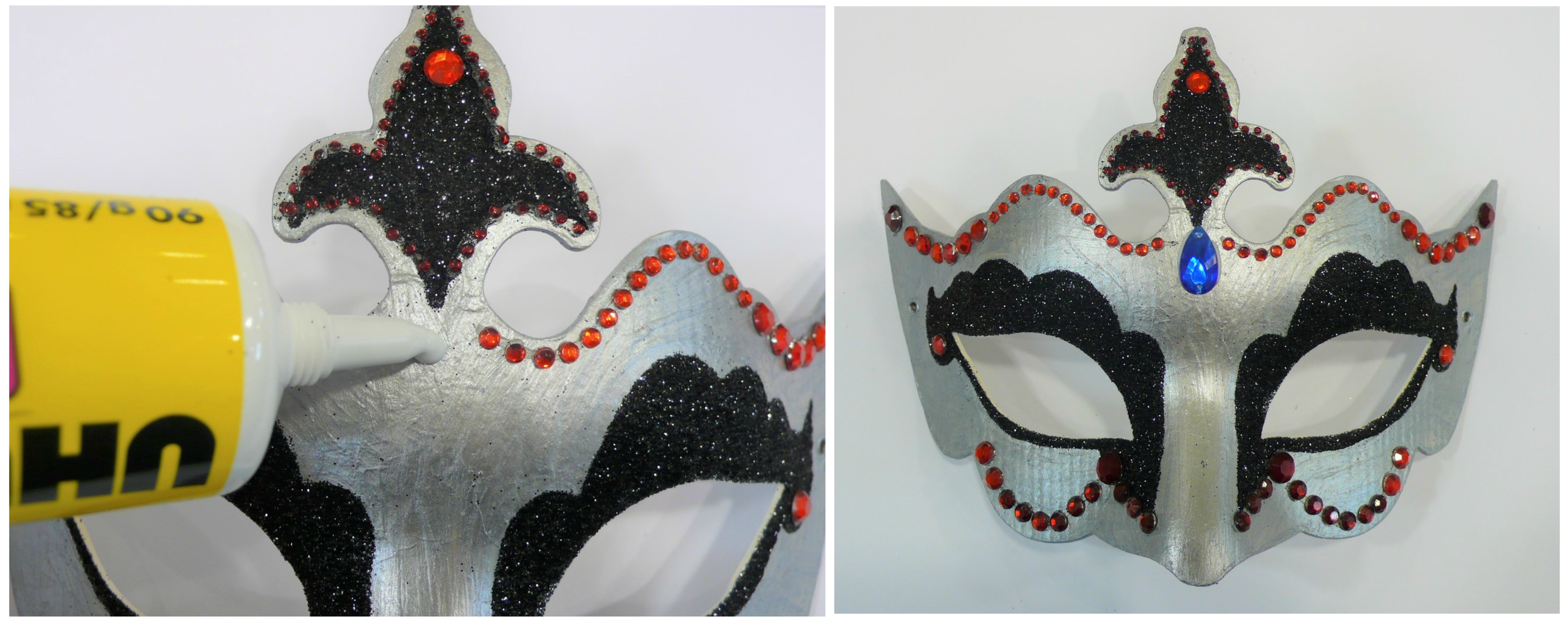 Prilepite maski na čelo moder kristal z lepilom UHU Bastelkleber.