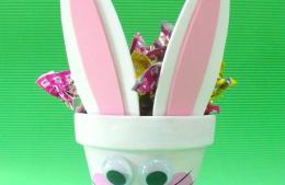 Prisrčen zajec je izdelan iz večjega glinenega lončka in  pobarvan z akrilnimi barvami. Otroci bodo nad njim navdušeni!