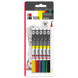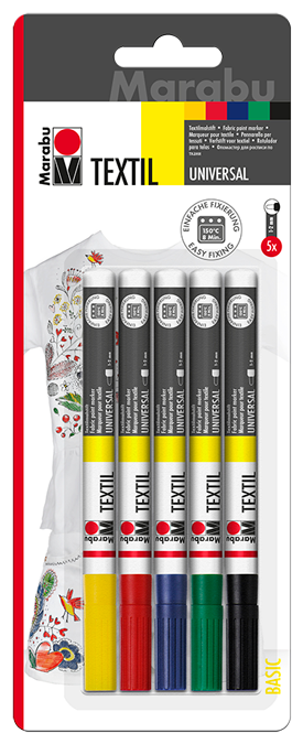 Flomastri za tkanine Marabu Textil Painter so polnjeni z barvami za tkanine na vodni osnovi. Z njimi lahko ustvarjate na skoraj vseh svetlih naravnih tkaninah, s katerih so bili predhodno odstranjeni vsi ostanki apreturnih sredstev, belila, mehčalca in umazanije. Utrjeni motivi so obstojni proti bledenju in pranju v pralnem stroju pri temperaturah do 60 °C. Tkanine navkljub narisanim motivom ohranijo svojo mehkobo. V kompletu je 5 flomastrov za tkanine s konico debeline 1 – 2 mm (019 - rumen, 031 – češnjevo rdeč, 053 – temno moder, 067 - zelen, 073 - črn)