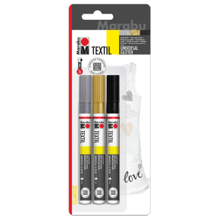Flomastri za tkanine Marabu Textil Painter Glitter in Marabu Textil Painter Plus so polnjeni z barvami za tkanine na vodni osnovi, ki so zelo dobro prekrivne. Z obema vrstama flomastrov lahko ustvarjate na skoraj vseh svetlih in temno obarvanih naravnih tkaninah, s katerih so bili predhodno odstranjeni vsi ostanki apreturnih sredstev, belila, mehčalca in umazanije. Utrjeni motivi so obstojni proti bledenju in pranju v pralnem stroju pri temperaturah do 40 °C. Tkanine navkljub narisanim motivom ohranijo svojo mehkobo. V kompletu so trije flomastri za tkanine s povečano prekrivnostjo z dodatkom bleščic (573 – črn, 582 – srebrn, 584 – zlat). Konica je debela 3 mm.