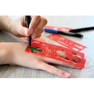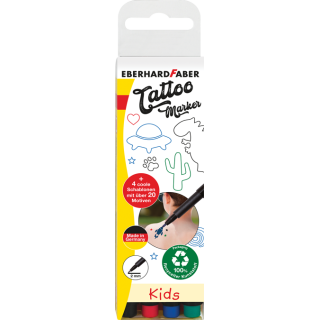 Komplet vsebuje 4 flomastre (rdeča, modra, zelena, črna) in 4 šablone z več kot 20 motivi. Za dolgotrajen in realističen videz Tattoo-ja (viden do 60 ur). Uporaba je povsem preprosta! S flomastrom narišite motiv in počakajte približno 5 minut, da se barva posuši. Motiv lahko povsem enostavno odstranite z vodo in milom. Iz večine tkanin lahko madeže izperete s pranjem v pralnem stroju pri temperaturi 40 °C z običajnim programom pranja. Barvni odtenki se na različnih vrstah in barvah kože lahko razlikujejo. Dermatološko testirani!