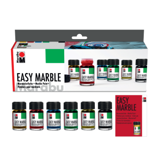 Barve za marmoriranje Marabu Easy marble so izdelane na osnovi organskih topil. V vodi niso topne, zato kot medij za marmoriranje lahko uporabite kar vodo. Barve za marmoriranje so primerne za uporabo na različnih materialih, tako na plastiki, lesu, steklu, papirju, japonskem papirju, svečah, kartonu, stiroporu in celo na svili in ostalih tankih tkaninah. Manjše predmete lahko marmorirate s potapljanjem v vodo, na katero nakapljate barvo Marabu Easy marble, za večje predmete in tkanine pa priporočamo uporabo preprostega medija za marmoriranje, npr. lepila za tapete. Barve za marmoriranje Marabu Easy marble niso primerne za barvanje živil!