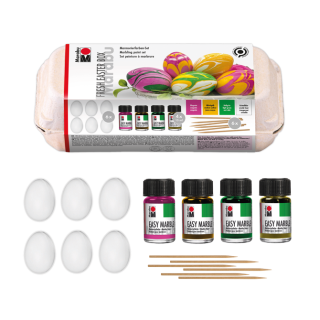 Nepremagljive barve velikonočnih pisanic! V kompletu je vse kar potrebujete za izdelavo čudovitih, barvitih pisanic: štiri barve za marmoriranje Marabu Easy marble (014 – škrlatna (magenta), 021 – rumena, 062 – svetlo zelena in 101 – brezbarvna), 6 belih plastičnih jajc (6 cm), 6 lesenih paličic (10 cm) in navodila za delo.