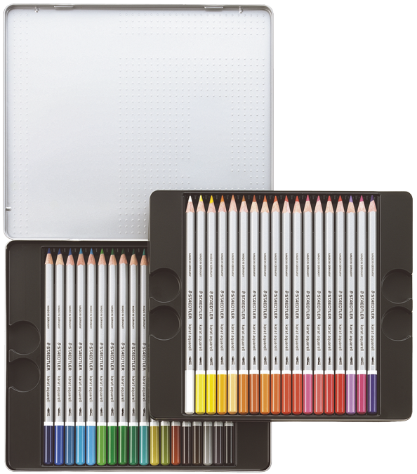 Akvarel lahko naslikate tudi s suhimi akvarelnimi barvicami! Če sliko, narisano z akvarelnimi barvicami, prevlečete z mokrim čopičem se sledi barvic v vodi raztopijo in razlijejo. Tako dobimo čisto pravi akvarel. Z mokrim čopičem lahko raztopljene sledi barvic tudi mešate med seboj. Mehkejša barvna mina omogoča risanje in barvanje z manj napora, saj akvarelne barvice med delom ni potrebno močno pritiskati ob podlago. Barvna sled je intenzivna in topna v vodi. Zaradi natančno izdelanega lesenega telesa, ki mino tesno objema, so akvarelne barvice Staedtler in Eberhard Faber bolj odporne proti lomljenju mine.