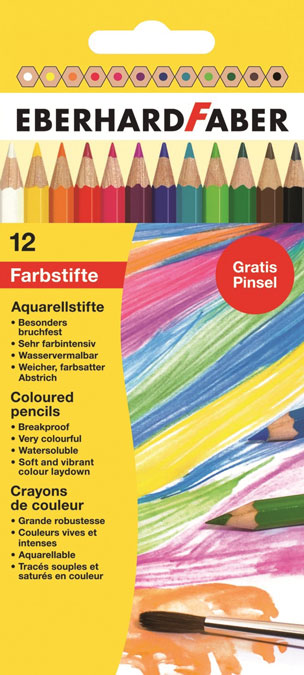 Akvarel lahko naslikate tudi s suhimi akvarelnimi barvicami! Če sliko, narisano z akvarelnimi barvicami, prevlečete z mokrim čopičem se sledi barvic v vodi raztopijo in razlijejo. Tako dobimo čisto pravi akvarel. Z mokrim čopičem lahko raztopljene sledi barvic tudi mešate med seboj. Mehkejša barvna mina omogoča risanje in barvanje z manj napora, saj akvarelne barvice med delom ni potrebno močno pritiskati ob podlago. Barvna sled je intenzivna in topna v vodi. Zaradi natančno izdelanega lesenega telesa, ki mino tesno objema, so akvarelne barvice Staedtler in Eberhard Faber bolj odporne proti lomljenju mine.