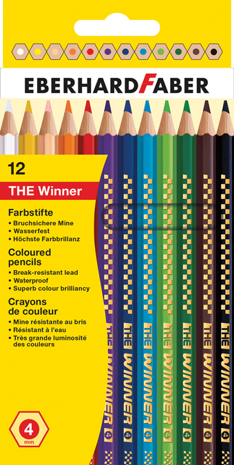 Odebeljene šestkotne barvice The WINNER so prilagojene otrokom v prvih razredih osnovne šole. Imajo 4 mm debelo, močno pigmentirano barvno mino, odporno proti lomljenju. Njena posebna (mehkejša) sestava omogoča risanje in barvanje z manj napora, saj barvice med delom ni potrebno močno pritiskati ob podlago. Barvna sled je intenzivna in vodoodporna. Barvica je v spodnjem delu potiskana z vzorcem, ki omogoča dober prijem.
