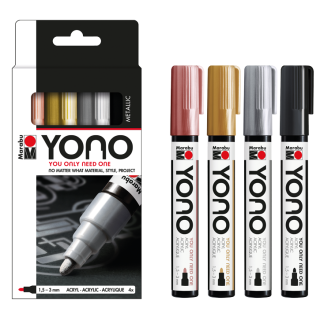 Univerzalni akrilni flomaster Marabu YONO je polnjen z visokokakovostno mat akrilno barvo na vodni osnovi, ki je dobro prekrivna (razen fluorescentnih barv, ki so srednje prekrivne) in odporna na bledenje (razen fluorescentnih barv, ki so le delno odporne na bledenje. Intenzivne barve, ki so skoraj brez vonja, ponujajo številne možnosti. Ni važno kakšno nalogo na kakšni podlagi želite opraviti – eden za vse!