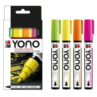 Univerzalni akrilni flomaster Marabu YONO je polnjen z visokokakovostno mat akrilno barvo na vodni osnovi, ki je dobro prekrivna (razen fluorescentnih barv, ki so srednje prekrivne) in odporna na bledenje (razen fluorescentnih barv, ki so le delno odporne na bledenje. Intenzivne barve, ki so skoraj brez vonja, ponujajo številne možnosti. Ni važno kakšno nalogo na kakšni podlagi želite opraviti – eden za vse!