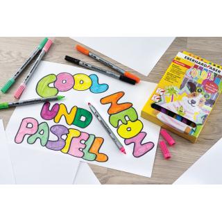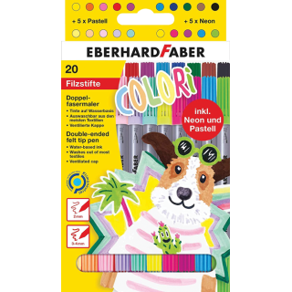 Komplet vsebuje 10 flomastrov z osnovnimi barvami, 5 flomastrov intenzivnih neonskih barv in 5 flomastrov v pastelnih barvah.