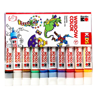 Pustite domišljiji prosto pot! Komplet vsebuje 10 plastenk (25 ml) barve Marabu Fun & fancy (019 – rumena, 013 – oranžna, 038 – rubinasto rdeča, 251 – vijoličasta, 095 – azurno modra, 055 – ultramarin modra, 062 – svetlo zelena, 046 – srednje rjava, 070 – bela, 073 – črna kontura) in predlogo z motivi za prerisovanje velikosti A4.