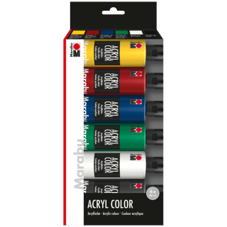 V kompletu je 6 plastenk (80 ml) najpogosteje uporabljanih barv Marabu Acryl Color (021 srednje rumena, 038 rubinasto rdeča, 053 temno modra, 067 zelena, 070 bela in 073 črna).