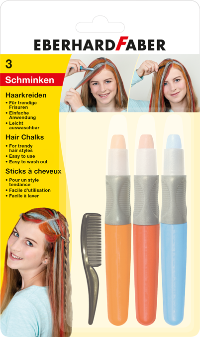 Dopolnite kostume in modne dodatke. Obarvajte lase s posebnimi voščenkami Eberhard Faber. Barvate lahko samo izbrane dele las ali pa s priloženim glavnikom barvo nanesete po celotni dolžini pramena. Barvo z las enostavno izperete.