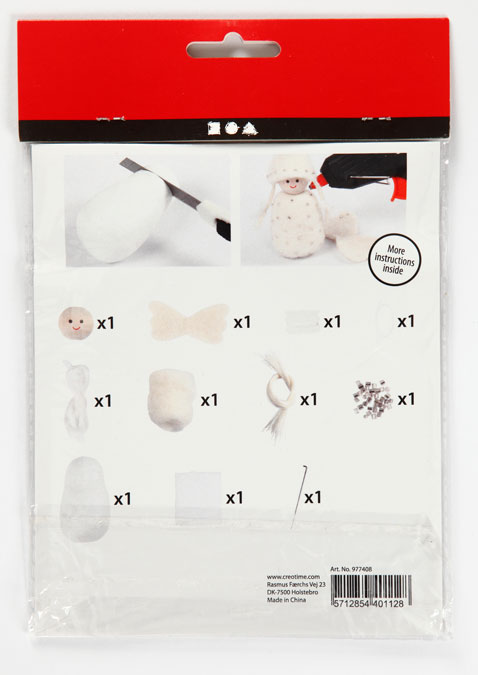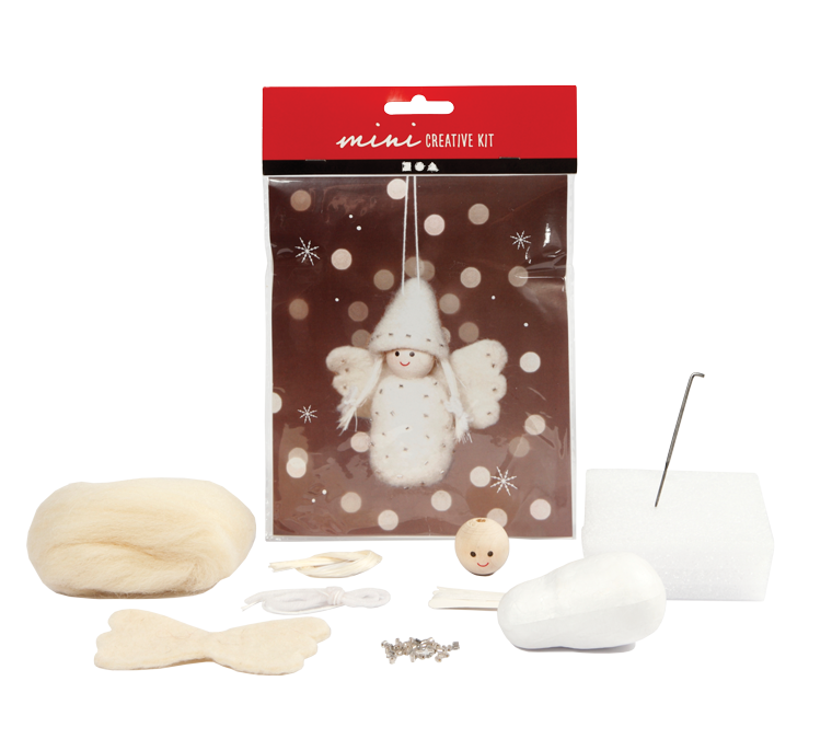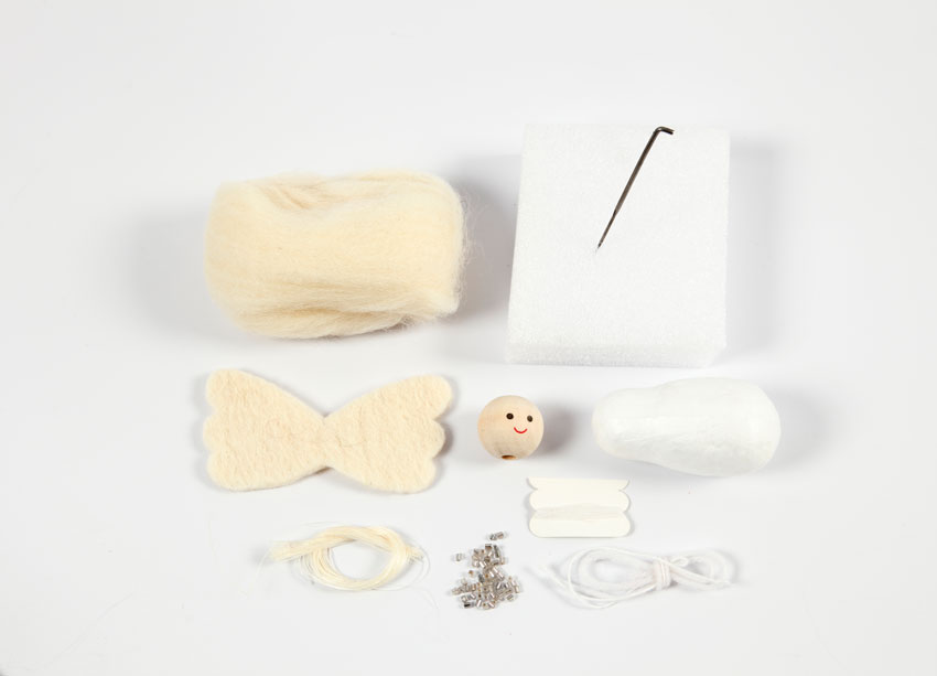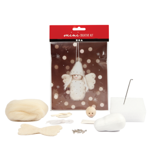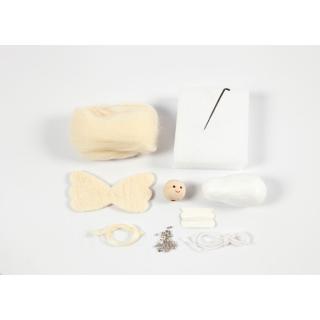 Komplet vsebuje vse potrebno za izdelavo angela s tehniko polstenja (velikosti približno 10 cm). V kompletu najdete belo volno, krila izsekana iz filca, kroglico z naslikanim obrazom angela, telo angela iz stiropora, kroglice iz semen, laske, vrvice za obešanje, sukanec in iglo za polstenje. Priložena so tudi slikovna navodila za izdelavo angela.
