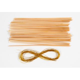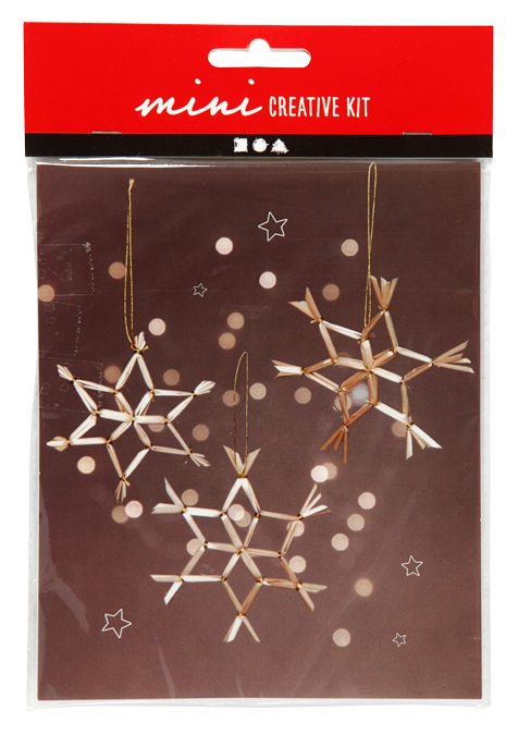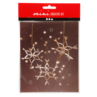 Snežinke iz naravnih materialov! Komplet vsebuje vse potrebno za izdelavo 3 snežink iz slame velikosti približno 10 cm. Priložena je tudi zlata vrvica za obešanje in slikovna navodila za izdelavo.