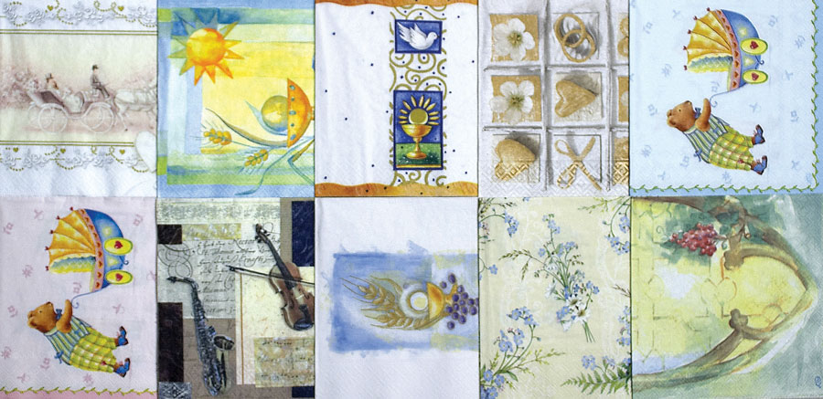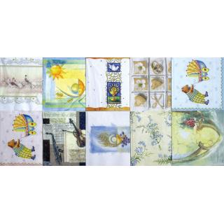 Kakovostne 3 slojne papirnate serviete so, skupaj z ustreznimi mediji za servietno tehniko, primerne za izdelovanje najrazličnejših dekoracij na kartonu, papirju, porcelanu, različnih trdih podlagah in na tkaninah. V vsakem kompletu je 10 različnih papirnatih serviet s tematsko podobnimi motivi.