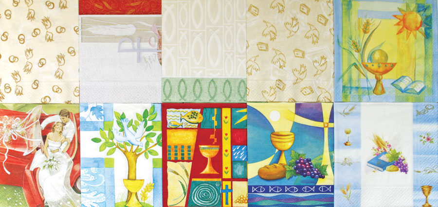 Kakovostne 3 slojne papirnate serviete so, skupaj z ustreznimi mediji za servietno tehniko, primerne za izdelovanje najrazličnejših dekoracij na kartonu, papirju, porcelanu, različnih trdih podlagah in na tkaninah. V vsakem kompletu je 10 različnih papirnatih serviet s tematsko podobnimi motivi.