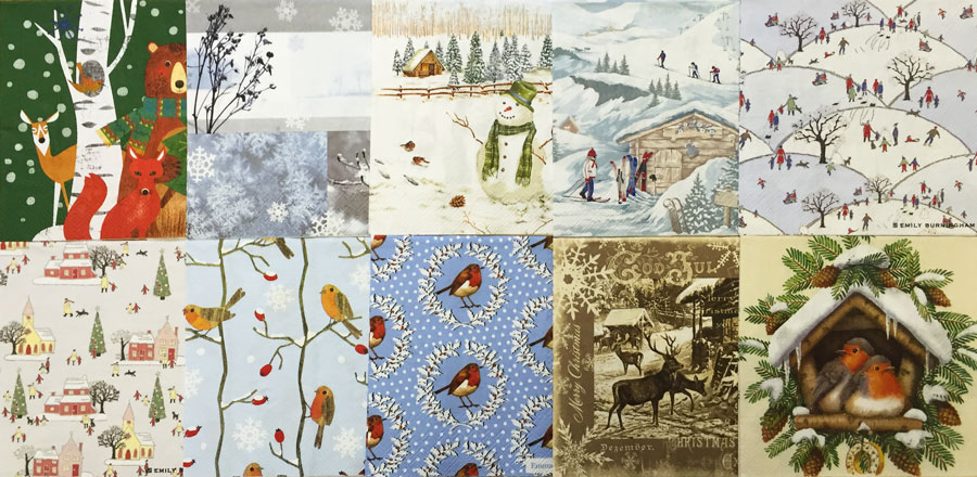 Kakovostne 3 slojne papirnate serviete so, skupaj z ustreznimi mediji za servietno tehniko, primerne za izdelovanje najrazličnejših dekoracij na kartonu, papirju, porcelanu, različnih trdih podlagah in na tkaninah. V vsakem kompletu je 10 različnih papirnatih serviet s tematsko podobnimi motivi.