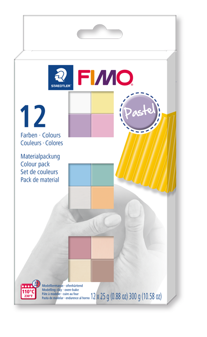 Vsebina: 12 blokov (po 25 g) modelirne mase FIMO soft v pastelnih odtenkih.