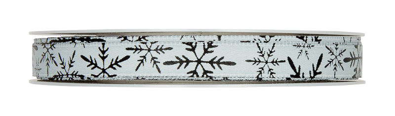 Satenast trak, 10 mm, snežinke, črn, 1 m