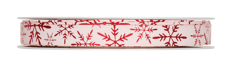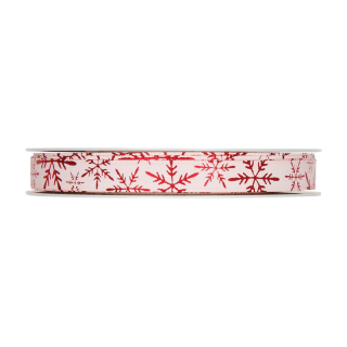 Satenast trak, 10 mm, snežinke, rdeč, 1 m