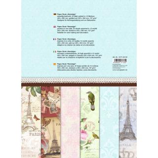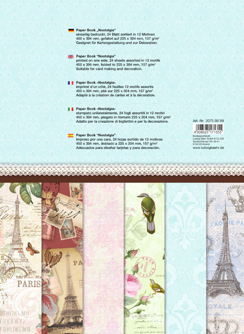 V bloku je 24 pol papirja (157 g), enostransko potiskanega z 12 različnimi retro motivi. Pole papirja merijo 450 x 304 mm, površina papirja je rahlo svetleča. Primeren je za izdelavo dekoracij in voščilnic.