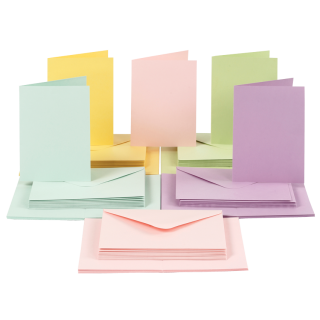Komplet vsebuje 50 parov voščilnic (220 g) in kuvert (110 g) v 5 različnih pastelnih barvah (5 x 10 parov). Dvodelne voščilnice so velike 10,5 x 15 cm, priložene kuverte enakih barv pa 11,5 x 16,5 cm.