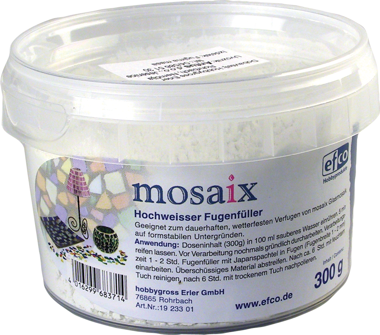Za lep videz mozaika je potrebno obdelati tudi prostor med posameznimi koščki. V ta namen smo vam pripravili kvalitetno belo fugirno maso, ki bo še bolj poudarila pestrost barvnih vzorcev vašega mozaika.