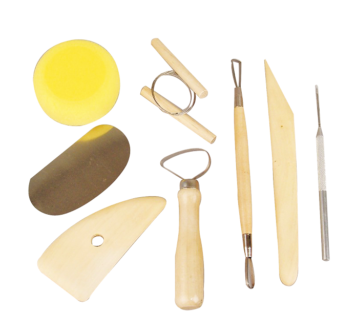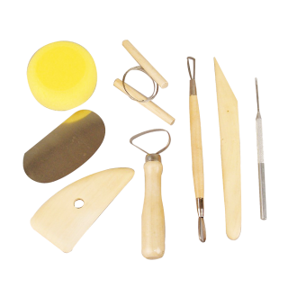 Orodje za lončarje! Komplet vsebuje vsa osnovna orodja in pripomočke za obdelavo gline in drugih gnetljivih materialov: leseno ledvičko, žico za rezanje, kovinsko iglo, dvostransko modelirko z zanko, leseno modelirko, modelirko za dolbenje, gobico in gladilko.