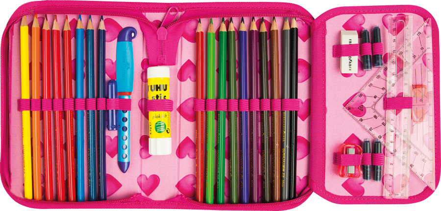 Trpežne, barvite peresnice v različnih motivih vsebujejo 17 barvic in 1 svinčnik s trikotnim prerezom, radirko, šilček, 4 črnilne vložke (bombice), ravnilo, geo-trikotnik, lepilo UHU stick 8,2 g, urnik, 2 sponki za papir, podaljšek svinčnika in silhueto nalivnega peresa. Peresnica se zapira z zadrgo.