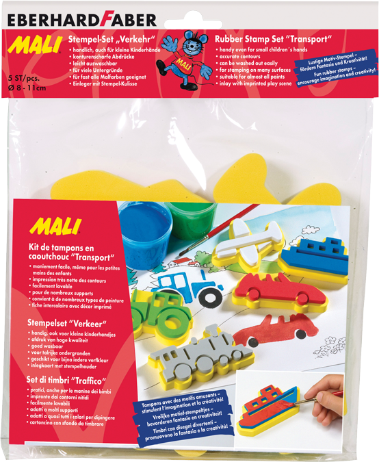 Komplet vsebuje naslednje štampiljke: letalo, ladja, traktor, lokomotiva in avto.